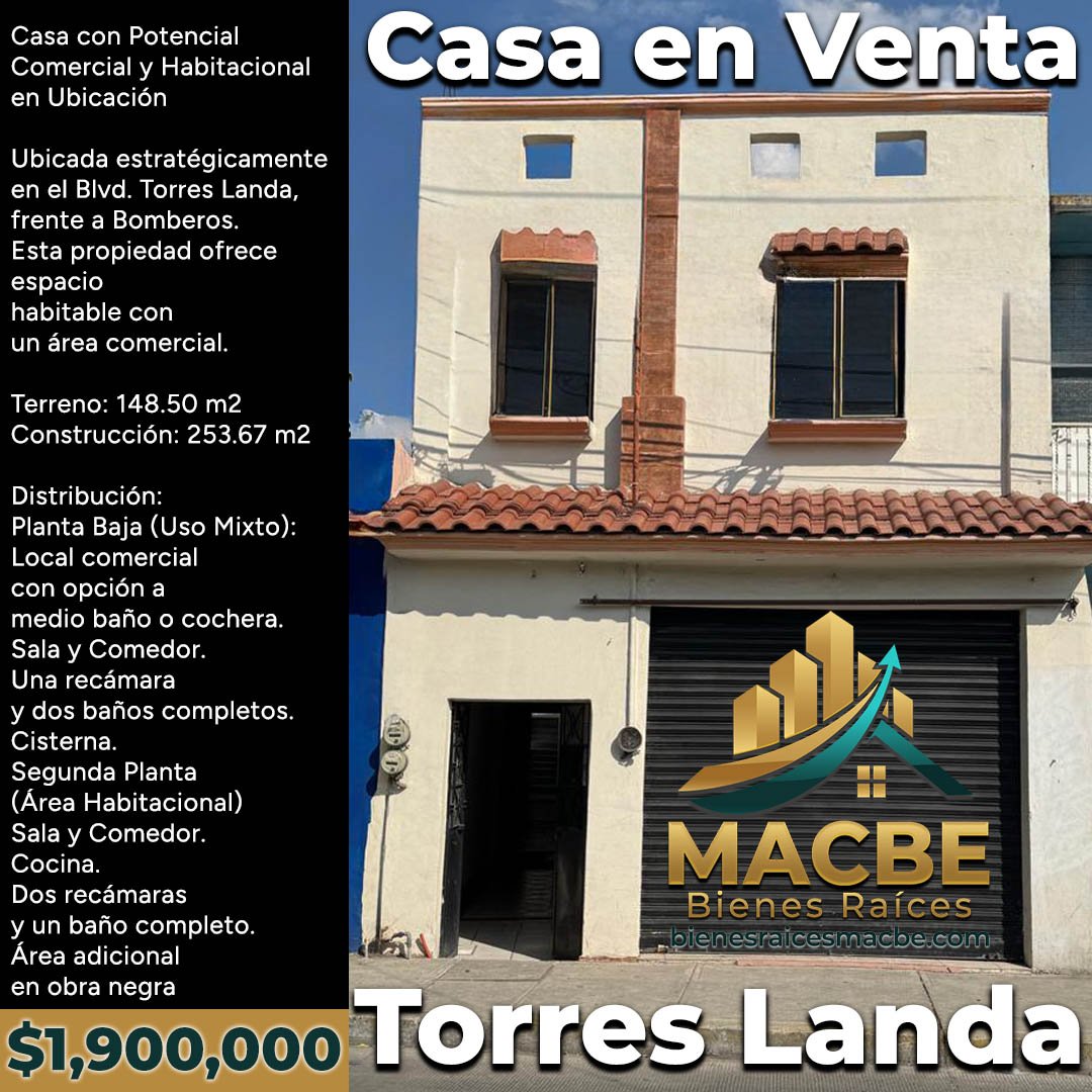 Ubicada en el Blvd. Torres Landa, esta propiedad de 253.67 m² de construcción sobre un terreno de 148.50 m² ofrece una separación inteligente de espacios: la planta baja dedicada al comercio o usos múltiples, y la planta alta a la vivienda. Es una oportunidad clara y directa para el inversionista que busca capitalizar la alta afluencia de una avenida principal.